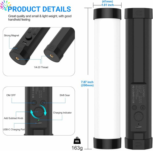 👍【Portable Light Wand】 RGB LED video light is made of Hard PC and Soft light mask with great heat dissipation. Only 163g/0.35lb weight, 20cm/7.87″ in length and 4.1cm/1.61″ in width. Apply to portrait, livestreaming, ambient lighting, light paint and photography etc