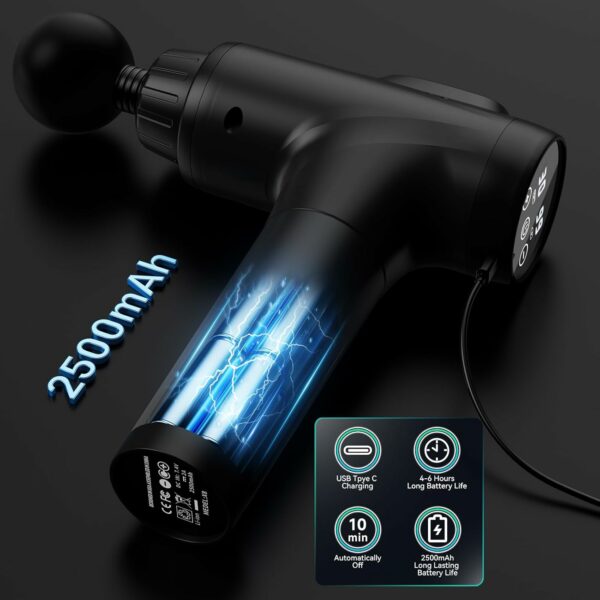 Relaxing massage on the go: Take our portable massage gun with you anywhere (to your gym or office or on a trip) without worrying about electricity outlets or power cords. The 2500mAh battery keeps the massage gun going for 4 to 6 hours, while the soft, whisper-quiet motor lets you truly relax