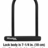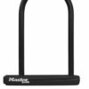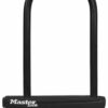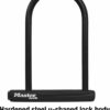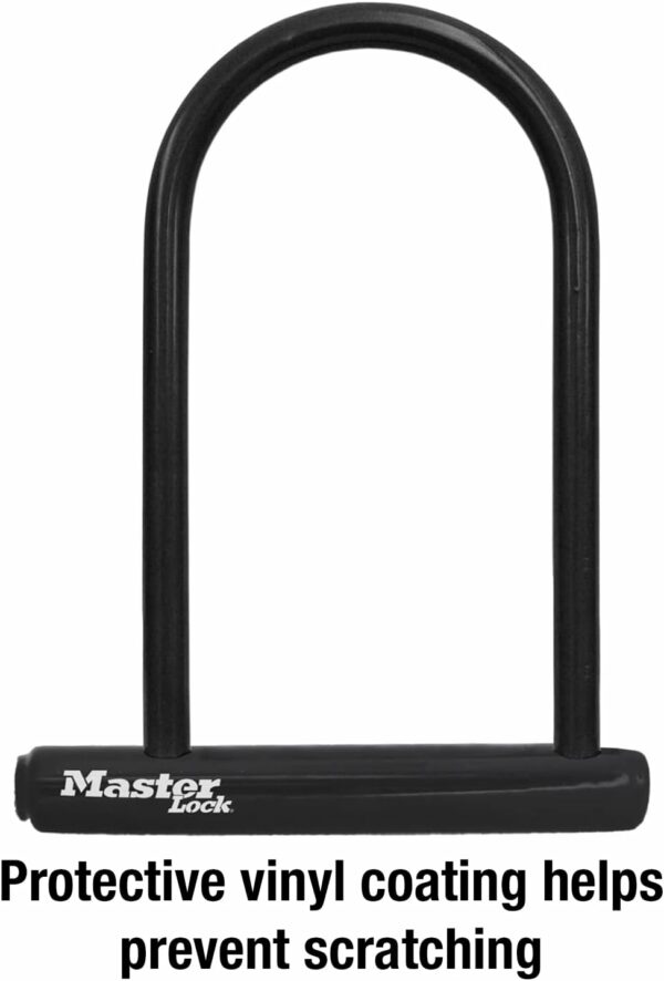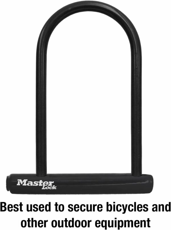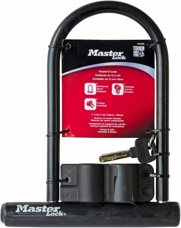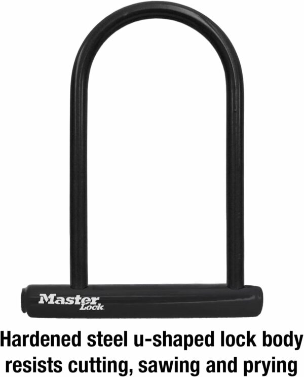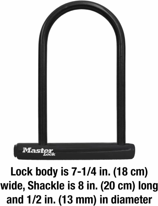 The Master Lock no. 8320D u-lock features a 7-1/4 inch (18Cm) wide hardened steel body for maximum strength and reliability. The 1/2 inch (13Mm) diameter double locking shackle is 8 inches (20Cm) long and made of hardened steel, offering extra resistance to prying, cutting, and sawing. The disc key cylinder prevents picking..