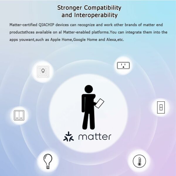 Discover the power of Matter! Never limited to any platform anymore. Matter light switch module works seamlessly across all certified smart home platforms such as Apple Home, Alexa, Google Home, and SmartThings, enabling interoperability of all platforms and all Matter smart home devices.