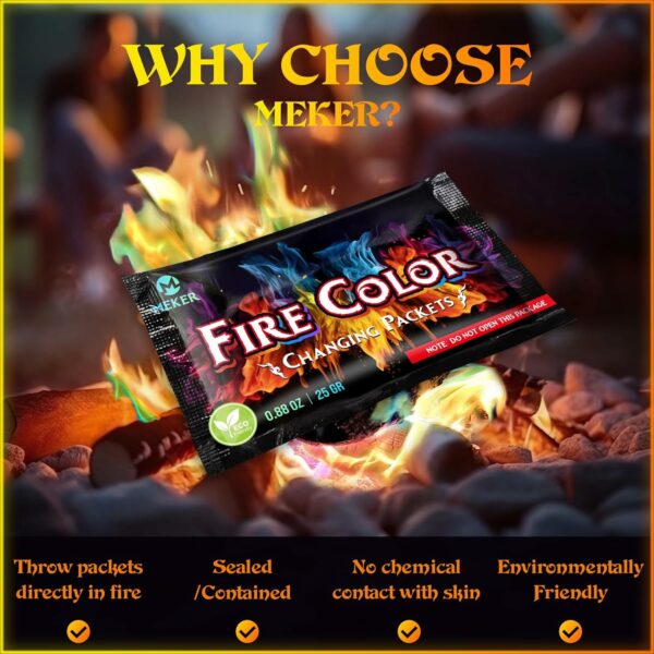 Why Choose MEKER? – 1) Throw packets directly into fire 2) Sealed/Contained 3) No chemical contact with skin 4) Provides a safe and controlled way to enjoy a fire in your backyard 5) Last twice as long as other brands!