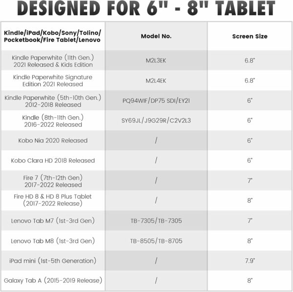Compatibility: Universal hand strap holder with durability and elasticity to fit 6 – 8″ E-Reader and tablet, including Fire Tablet/Kindle/Kobo Nia/Kobo Clara HD/Lenovo tab M7/tab M8/Voyaga/Sony/Tolino tablet, etc. (Note: Please measure your e-book readers or tablets before purchase.)