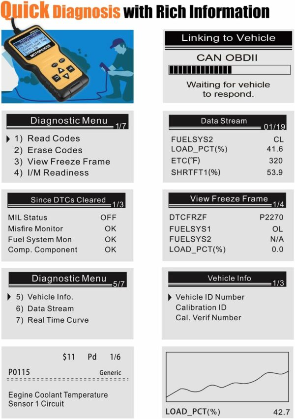 Multi-Functions – Practical Multi-Functions OBD2 code reader features built-in OBD2 DTC lookup library, which help you to determine the cause of the engine light, read code, erase code, view freeze frame, I/M ready, vehicle information, data flow, real-time curve, get vehicle speed information, calculate load value, engine coolant temperature, get engine speed.