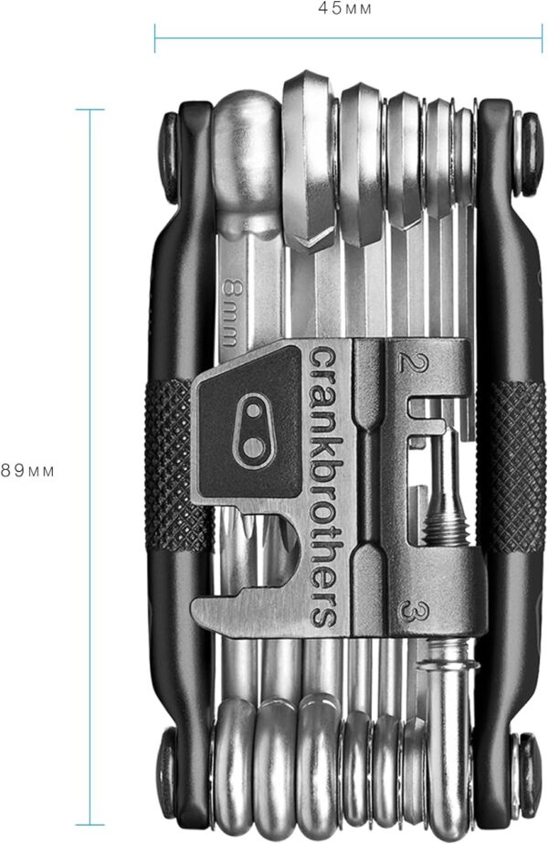 19 features. Includes a light, durable aluminum case. Weight: 175g. Length: 3. 5″ / 89 mm. Material: frame – 6061-t6 aluminum. tools – 6051 high tensile steel. Chain tool: 8/9 speed compatible. Spoke wrench: 1, 2, 3, 4. Hex wrenches: 2, 2. 5, 3, 5, 6, 8. Screwdrivers: 2 philips, 2 flat. Open wrench: 8mm, 10mm. Torx t-25. Carrying case: stainless / polymer. Lifetime . !