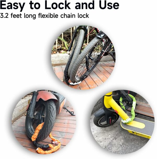 MULTI-PURPOSE: The chain lock is 3.2 feet, long enough to lock 2-3 bikes together, or lock your bike to a tree, gate, fence, railing, thick pole and others. The lock can also be used for motorcycles, scooters, skateboards, grills, ladders, doors, lawnmowers and many others. NDakter provides a one-year warranty, we’ll either replace it at no cost or issue you a full refund. NOTE: The male end of the chain is 1.25″ diameter, you’d better confirm the gap of spokes/hole to wrap through before your purchase. Otherwise, you can only lock your scooter by winding instead of the gaps in the wheels.