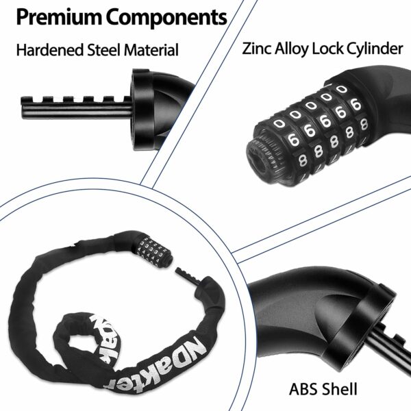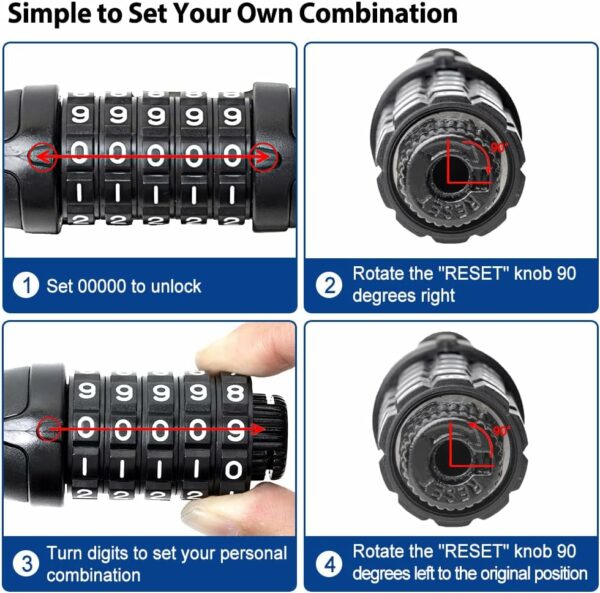 SECURE & RESETTABLE: Smart 5-digit resettable combination bike chain lock, much safer than other 4 digit locks. Easy to set your own personalized number combination.