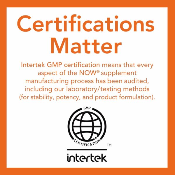 GMP Quality Assured: NPA A-rated GMP certification means that every aspect of the NOW manufacturing process has been examined, including our laboratory/testing methods (for stability, potency, and product formulation).