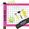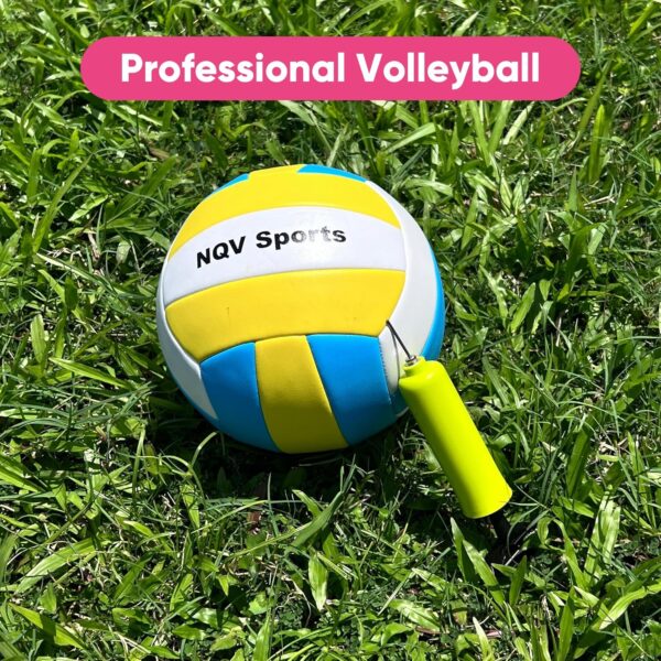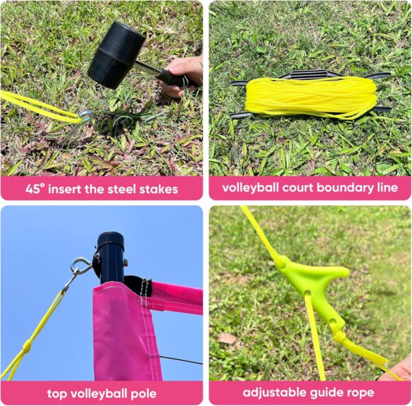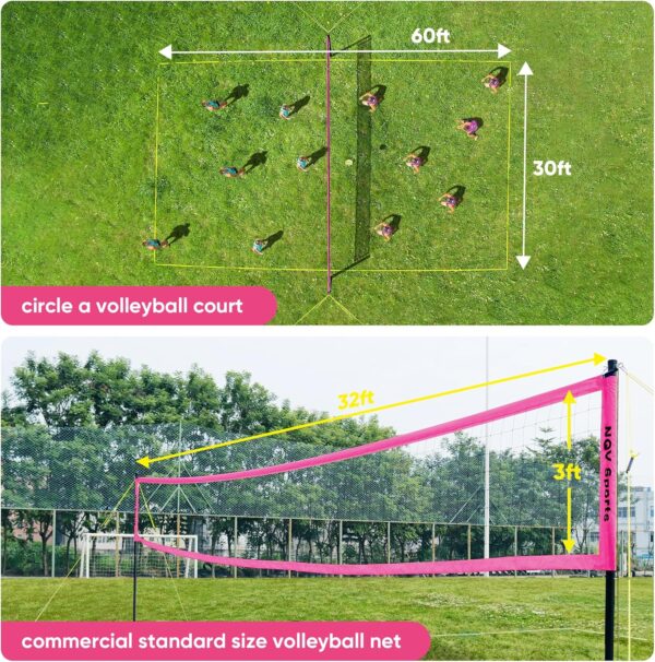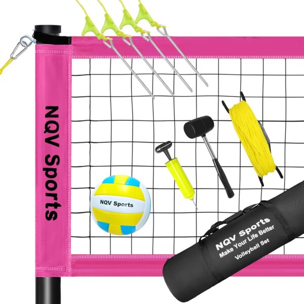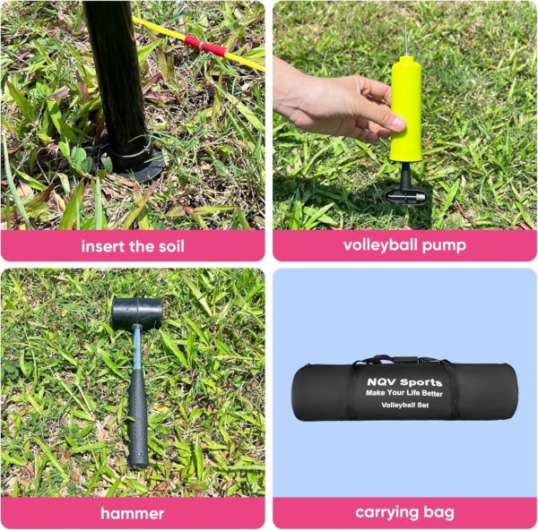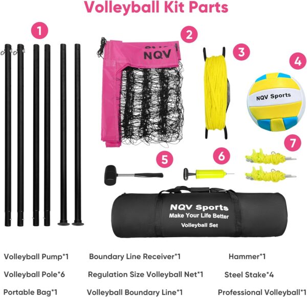 Volleyball Set for Backyard/Lawn/Beach: NQV volleyball set includes 1 volleyball net, 6 steel volleyball poles, 1 official volleyball,1 inflation pump with needle, 1 boundary tape,1 portable carrying bag, an instruction. Play volleyball with your friends and family outdoor when you have parties, cookout, BBQ. The volleyball poles are made of steel, but not get rusted since there are the powder coating on the surface of steel parts.