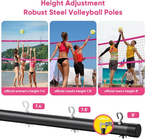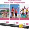 Height Adjustable Volleyball Poles: NQV volleyball net with poles are adjustable for 3 levels height. 8ft for men height, 7.8ft for co-play height, and 7.4ft for women height. It’s an inground volleyball set for adults and teens, not for kids.