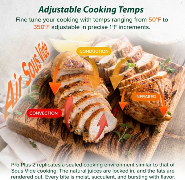 CUT THE FAT – Embrace a healthier lifestyle and cut the fat from your diet. The Pro Plus 2 employs advanced triple combo cooking technology that cooks your food from the inside and outside at the same time. This not only locks in flavor and juiciness but actively renders out unhealthy fat drippings. Compared to a conventional oven, 120% more fat drippings were rendered for 2 LB. 4 Oz. beef chuck roast; 125% more for over 3 LB. of chicken quarters; and 250% more for 3 LB. 9 Oz. of country style pork ribs.