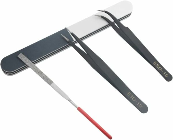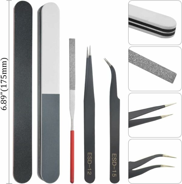 The vertical tweezer and the curved tweezer can perfectly help you to complete the disassembly and installation of various models. Flat files and sanding strips can be used to polish the edges and joints of various models.