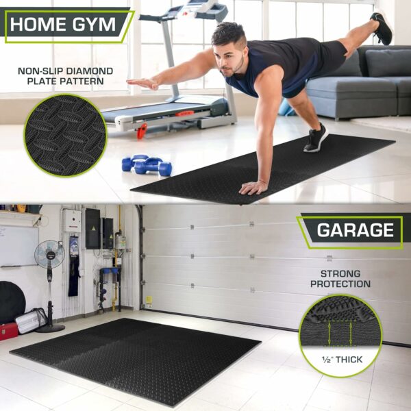 Versatile – The water-resistant, noise-reducing design is easy-to-clean, great for indoor purposes like in garages as a protector, gyms, a home fitness room, or even children’s play areas as a playmat.
