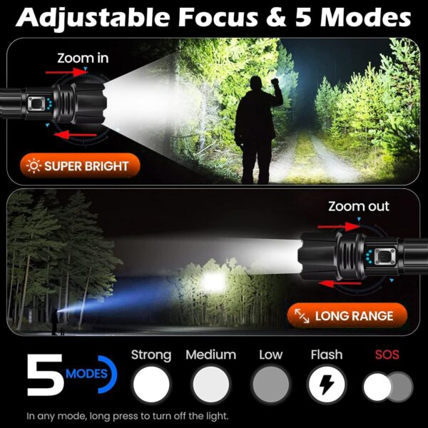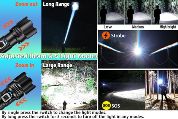 ADJUSTABLE BEAMS & 5 LIGHTS MODES : This handheld flashlight features 5 lighting settings: High, Medium, Low, Strobe, and SOS. Easily switch off the flash light by holding the button for 3 seconds in any mode. Adjust the beam focus by extending the rechargeable flashlights head, selecting between a focused spotlight for distant viewing or a wide floodlight for illuminating large areas. Perfect for camping gear, hiking, climbing, running, night walks, emergencies, or everyday household home use