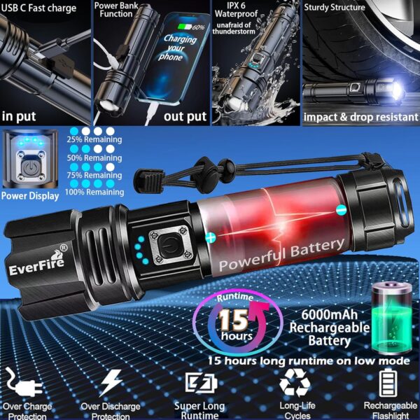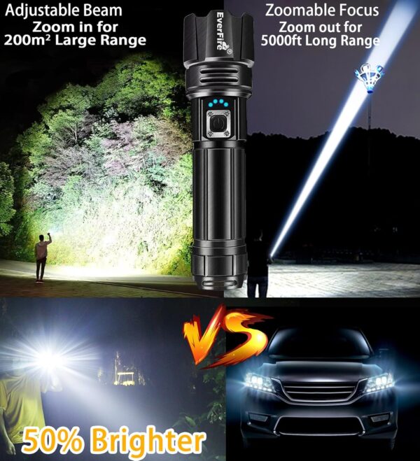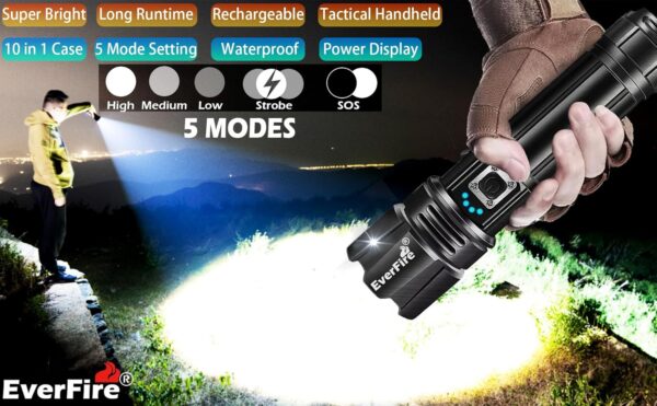 990,000 LUMEN LED FLASHLIGHT : EVERFIRE flashlights high lumens boasts an incredible powerful lighting, making it 30 times brighter than ordinary led flashlights. With its brightest upgraded EXP990 LED, it effortlessly illuminates a wide area to 200 square meter, effectively lighting up to 5000 feet, This flashlights high lumens rechargeable is the best gift for driver, mate, family, friends,colleagues, etc
