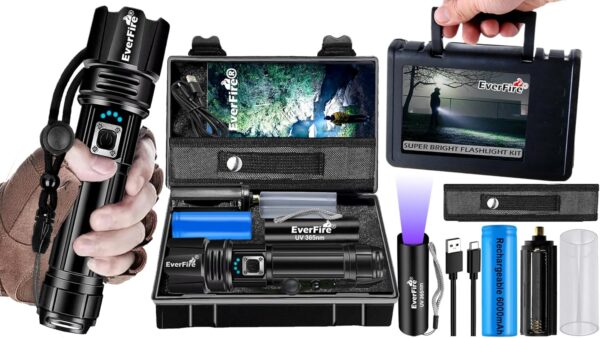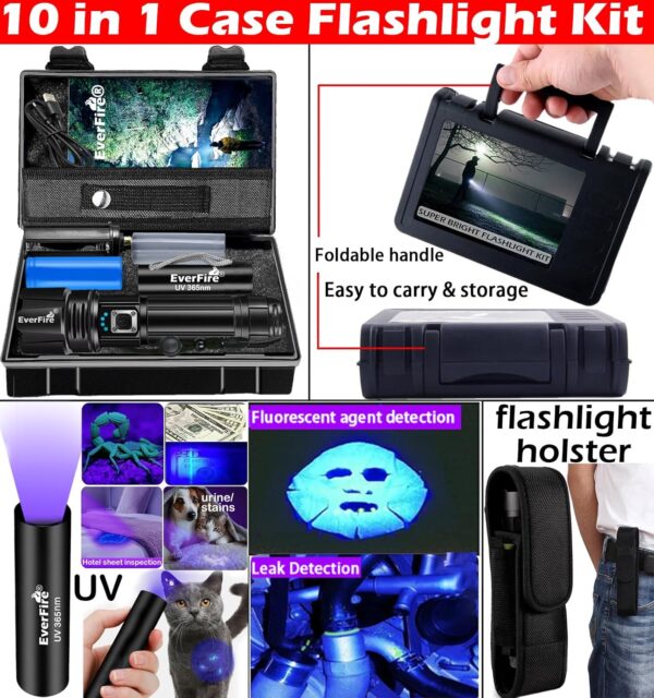 1.PORTABLE STORAGE GIFT BOX- Comes with an exquisite waterproof foldable storage case, which is not only portable, but also a gorgeous gift.2.Comes with a rechargeable UV 365nm black light flashlight – which emits a 365nm wavelength, perfect for showing things & details invisible to the unaided eye, such as urine/stains from dogs / cats and other pets, verifying driver’s licenses, official ID cards, passports, and currency. You can also check your campsite for little guys such as scorpions etc when camping at night,it is a must have tool for home/house and outdoor camping.3.RECHARGEABLE – Powered by an advanced EXP990 LED chip, our rechargeable flashlights boasts up to 990,000 lumens for unparalleled brightness. Illuminate entire rooms or pinpoint objects up to 3600 feet away. Its long runtime establishes it as a superior flashlight.4.BRIGHT 5 MODES – Tactical flashlight features 5 light modes: High, Medium, Low, Strobe, SOS. Capable of cutting through the deepest dark and mist.5.QUICK CHARGING – Rechargeable flashlights achieves full charge in just 3-4 hours via USB, compatible with both wall chargers and USB ports. Additionally, it serves as a power output device for charging your phone.6.EXTENDED RUNTIME – Flash light equipped with a powerful rechargeable ΒATTERY, it provides over 15 hours of outdoor lighting.7.POWER INDICATOR – The powerful flashlight power display feature allows for monitoring of remaining power life, ensuring timely recharging for your convenience.8.IPX6 WATERPROOF – Grade at IPX6, this flashlight is fully functional in rainy conditions, ensuring reliability when you need it most.