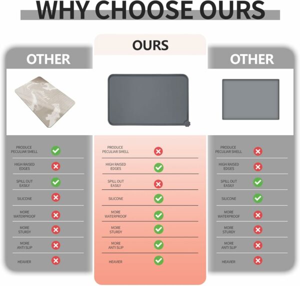 Anti-slip design: our non-slip pet feeding mat ensures stability for your pet’s bowl, preventing any water stains or spills on the floor. Enjoy peace of mind when feeding your pet, knowing that their food stays in place