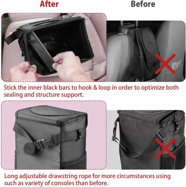 We’ve made massive improvements from voice of customers: 1. Structure Support – In order to keep the car garbage can staying in shape from collapsed, just attached two black side bars to hold its shape. The bars also optimize sealing to keep everthing inside. 2. Extra Long Adjustable Strap – We doubled the length of the nylon strap, so that allow this car accessories to hang on the front or back seats, most type of consoles, even anywhere you want in car.