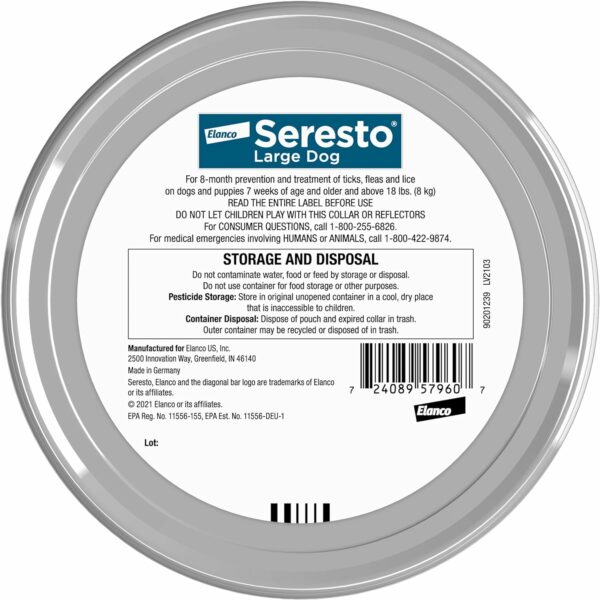 Give your dog long-lasting protection against fleas and ticks with a Seresto Large Dog flea and tick collar. Unlike other flea and tick protection, Seresto Large Dog flea and tick collars kill and repel fleas and ticks for eight continuous months. Seresto Large Dog flea and tick collars are recommended by veterinarians, stocked by 8,000 vet clinics* and have been trusted* by pet owners for nearly a decade. Seresto Large Dog collars make your dog’s comfort a priority by killing fleas and ticks on contact, so pests don’t have to bite your dog to die. Existing fleas die within 24 hours after initial application of the collar. After 24 hours, any new fleas on the dog are killed within 2 hours with protection against further flea infestation lasting 8 months. The prevention of infestations with new ticks starts at 48 hours after application of the collar. 48 hours after application, any new ticks are repelled and/or killed in as quickly as 6 hours. Seresto Large Dog collars protect against common pests like deer ticks, American dog ticks, brown dog ticks, and Lone Star ticks; they’re also effective against chewing lice. Fleas and ticks not only cause discomfort; fleas can transmit bartonellosis or tapeworm. Ticks can transmit Borrelia burgdorferi which causes Lyme Disease. Check the product label for information on potential side effects.