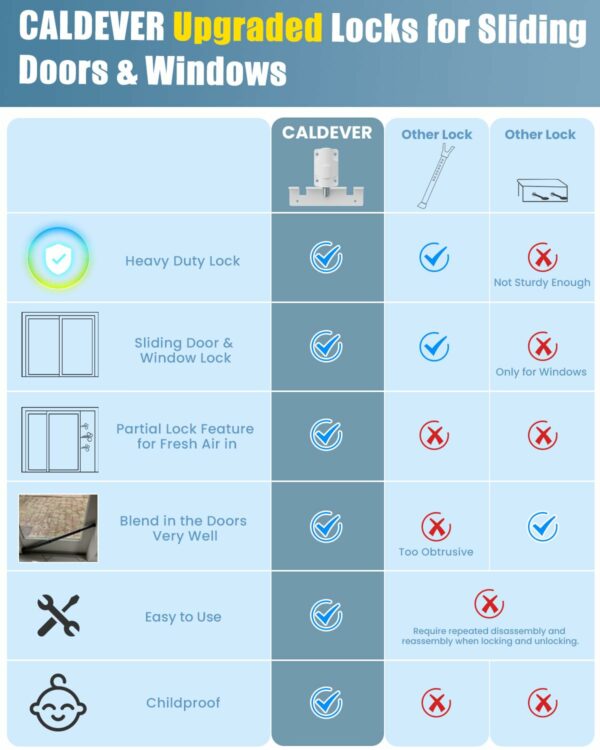 Upgraded Home Security Lock for Sliding Doors & Window: If you are concerned that your window and doors are not sturdy enough, CALDEVER heavy-duty sliding door lock provides added security and childproof lock safety, secure as extra door locks for the front door, sliding glass door lock, patio door lock, window locks for both vertical and horizontal sliding Window—an extra layer of security for apartment essentials and home safety. CALDEVER sliding door locks, protect yourself and your family