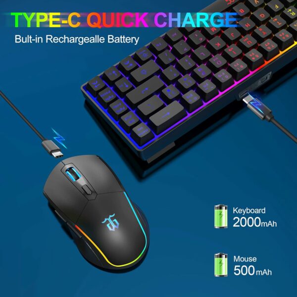 Rechargeable and Long Battery Life — This rechargeable 60 keyboard is equipped with 2000 mAh battery,and the mouse is equipped with a 500 mAh battery. It only takes 2 hours to charge the keyboard by 5V/1A , and it can be used continuously for more than 40 hours with light. Support energy-saving sleep mode