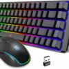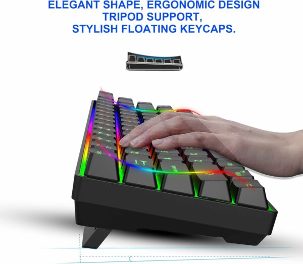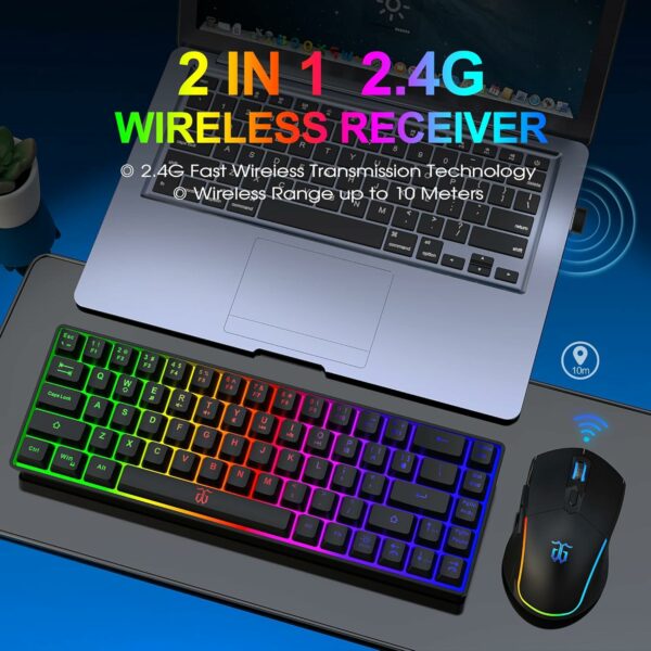 Colorful Light and Ergonomic Design — The mini wireless gaming keyboard has built-in three groups of rainbow backlight effects. The unique structural design and built-in steel plates, etc., make the small keyboard have a very similar black switch mechanical feel. The cute pocket-sized mouse contains seven brilliant colors.The wireless mouse buttons also make a crisp sound of game atmosphere.Try,you will feel so good in your hand