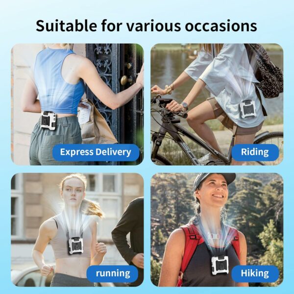 【Flexible Charging and Compact Size】This undershirt fan has fast charging support via USB chargers, laptops, computers, car chargers, and other USB-enabled devices, it is the perfect choice for home, office, desktop, travel, outdoor, car, and camping. Due to the compact size of this cooling fan which is only 290 grams, you can take this small fan anywhere you want. Not only can it be used indoors home, but it can also bring a cool feeling to your outdoor activities, like courtyard working, fishing, hiking, camping, and travelling