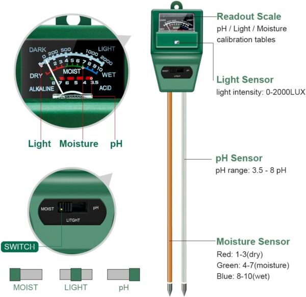 3 METERS IN ONE: Soil moisture level, Soil pH value and Sunlight level could be tested easily according to your need by switching the function button of this soil meter.