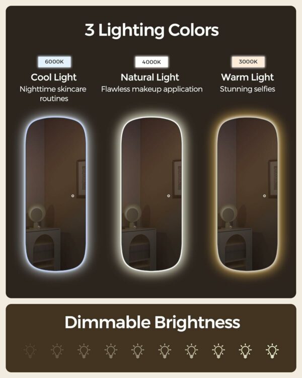 [Hidden LED Strip] Choose from 3 colors and adjust continuous dimming to cater to your needs. The hidden LED strip on the wall-mounted mirror enriches the atmosphere without occupying mirror space, adding to the aesthetic appeal when the lights are off