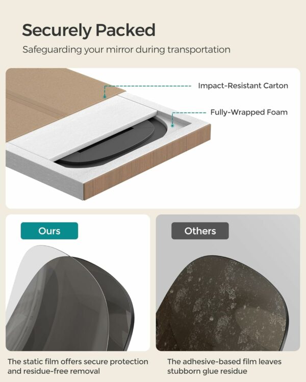 [Delivered Safe and Sound] With a robust carton and comprehensive foam packaging, coupled with the added protection of electrostatic film adsorption, we ensure your frameless mirror arrives unscathed and ready to impress