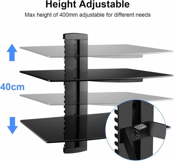 HEIGHT ADJUSTABLE: Post-installation height adjustments can be made to the wall mounted AV rack to ensure your devices are exactly where you want them. Position the AV wall mount’s shelving brackets anywhere along the track and secure them in place with the provided wrench.
