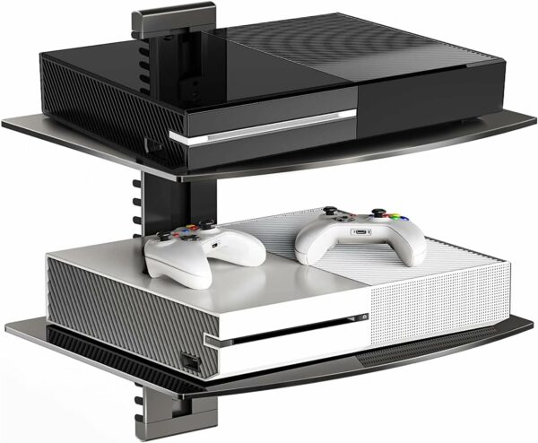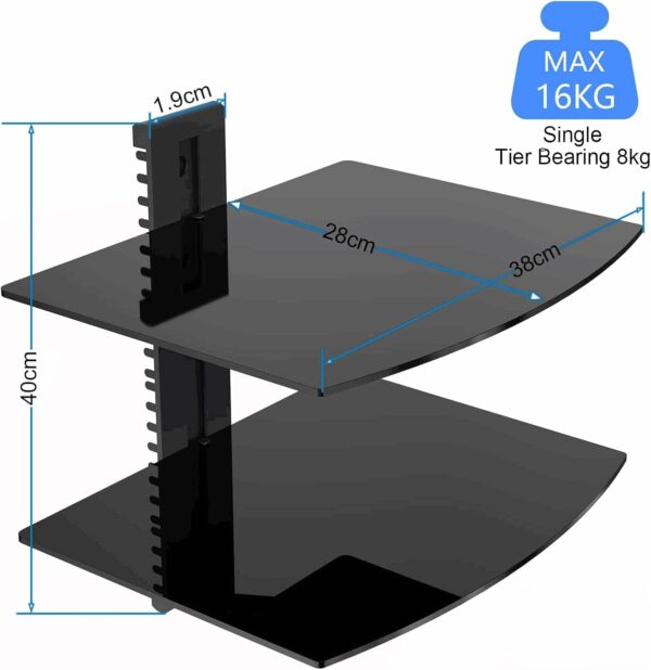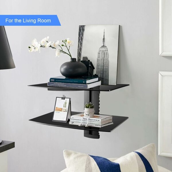 ELEGANT DESIGN: Featuring tempered glass and silver powder coated aluminum, which is durable and each shelf can support 17.6lbs(8kg), the floating tv shelf provide an elegant solution to organizing your home theater.