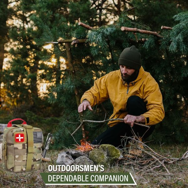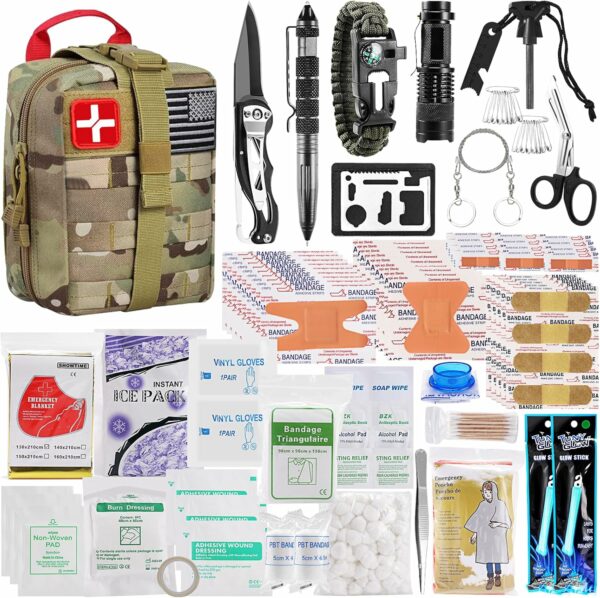 【Comprehensive Survival First Aid Kit, Perfect Gift for Outdoorsman.】This emergency kit was designed by our entire team after a long period of research, taking into account various medical or emergency needs for both outdoor activities and everyday life. The survival first aid kit includes a total of 282pcs emergency accessories, including 10 practical survival tools and 22 types of essential first aid medical supplies, making it an excellent companion for camping, hiking, road trips, etc.