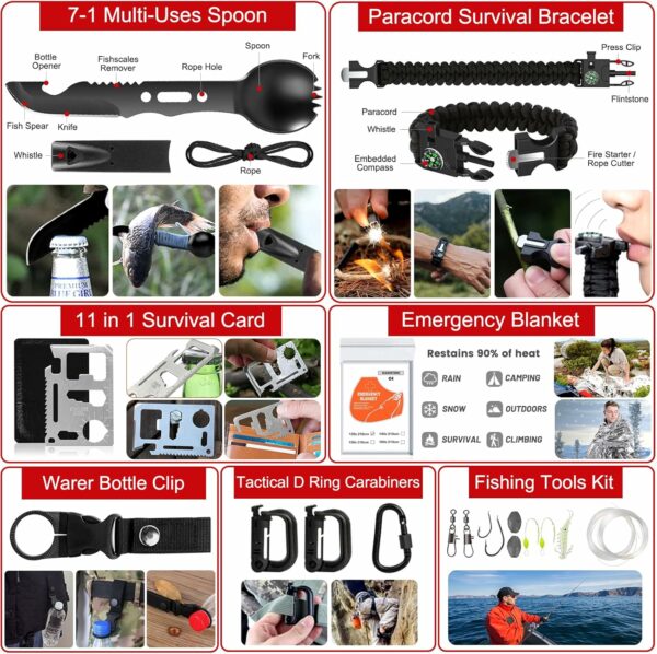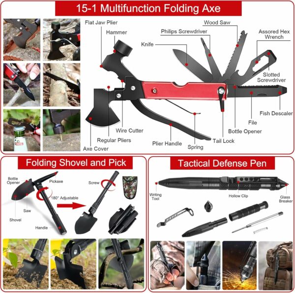 【Multiple Survival Gear and Equipment】The survival kits contain: many multi purpose tactical gears, like survival bracelet, folding shovel and pick, 15 in 1 hatchet, wire saw, multifunctional card, tactical defense pen, etc; some survival gears for keeping warm and calling for help, like emergency blanket, whistle; and some fishing tools. It’s a comprehensive tactical kit, a great helper of outdoor survival