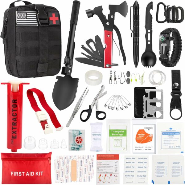 This is an amazing high-quality survival kit first aid kit with different essential multi-purpose outdoor emergency survival gear, different purpose medical supplies, common fishing tools, contain everything you and your family need during an emergency!