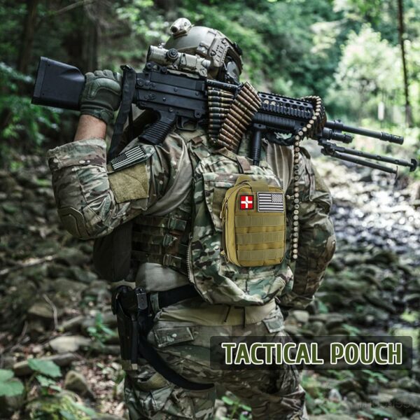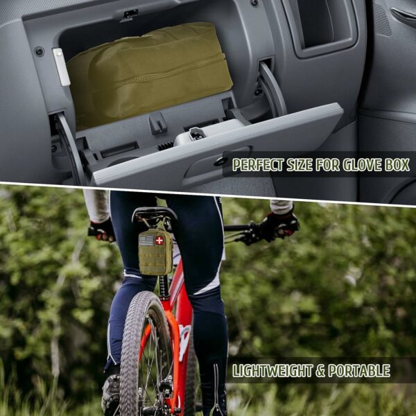 【Compatible and Portable】 The military grade MOLLE medical pouch is made of 1000D nylon, which is lightweight and waterproof. Inside the bag, there are three large compartments and several straps, all survival gear and equipment are stored in an organized and easy-to-find manner, making it easy to locate necessary items in an emergency situation. The MOLLE system on the back also allows you to easily attach the kit to your tactical vest, backpack, or belt.