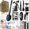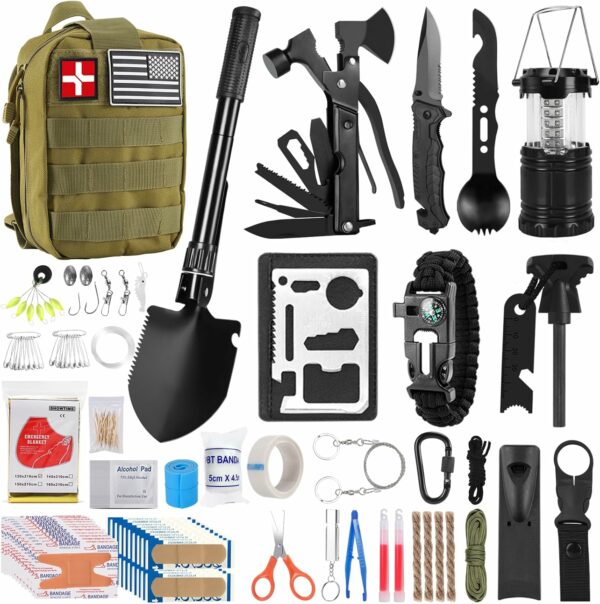 【Multiple Survival Gear and Equipment】170pcs survival kits contain: many multi purpose tactical gears, like survival bracelet, folding shovel and pick, 14 in 1 hatchet, wire saw, multifunctional card, parachute cord, etc; Some survival gears for keeping warm and calling for help, like collapsible tent lantern, flint stone & scraper, emergency blanket, dual-tube whistle, light stick; And some fishing tools. It’s a comprehensive tactical kit, a great helper of outdoor survival.