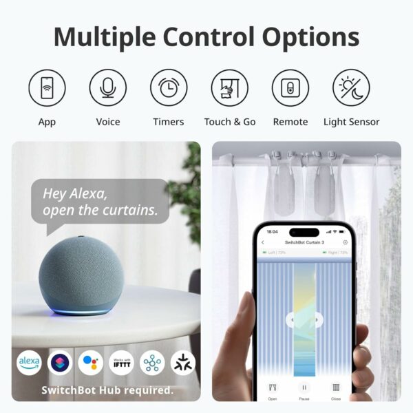 Multiple Control Methods: Use our app to manage curtain opening, closing, and open percentage. Set custom schedules for fully automated curtains. With SwitchBot Hub, you can also use voice commands via Alexa, Google Home, SmartThings, Siri Shortcuts, and IFTTT all from your sofa. ※If your curtains open in the middle you need two units.