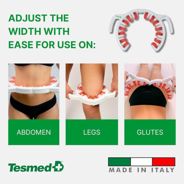 Just a few minutes a day: the characteristic shape of Tesmed Cellulite allows it to cover almost the entire area to be treated in a single pass, wrapping, for example, the thigh or enabling the treatment of both buttocks. Adjustable width: up to 15.2 inches to treat legs and buttocks.