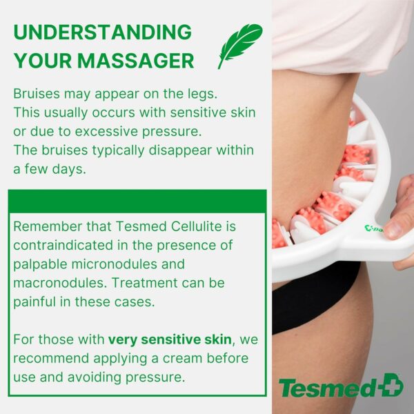 For sensitive skin prone to bruising and/or with fragile capillaries, the use of Tesmed Cellulite, especially at the beginning of treatment, may cause slight bruising, redness, and flaking. Bruises appear due to skin sensitivity or excessive pressure. Normally, bruises disappear within a few days. However, it is recommended not to press on the skin and, in the case of very sensitive or bruise-prone skin, or at your discretion, to apply a body or anti-cellulite cream beforehand to mitigate the pinching effect.