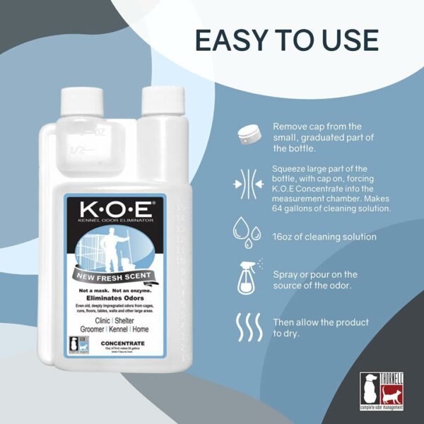 Easy to Use: Dilute KOE kennel odor eliminator concentrate with the recommended amount of water or cleaning solution. To reach the odor source, saturate the soiled area. The same dilution may be applied with a pump-up sprayer. Let air dry. If the odor persists after the concentrated deodorizer odor eliminator has dried, then reapply.