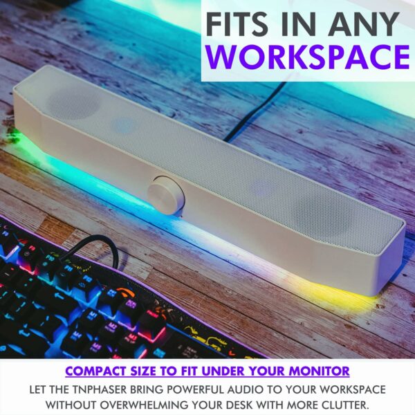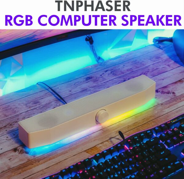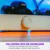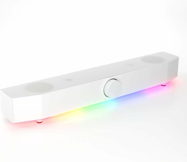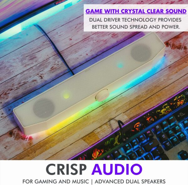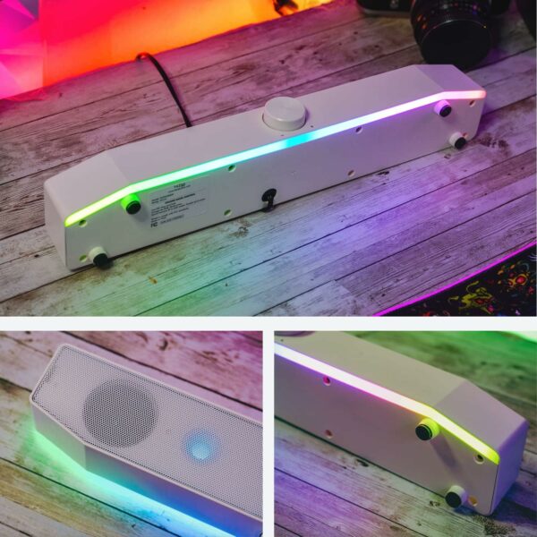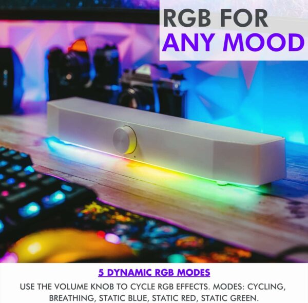Lighting for Any Vibe: Create the perfect gaming atmosphere. Our RGB computer speaker bar offers 5 lighting modes, Dynamic breathing, color cycling, and 3 static colors