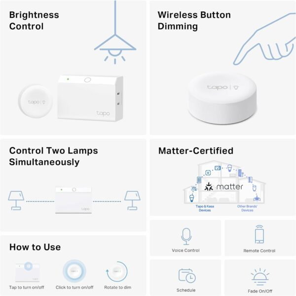 Tapo P135 Kit is a Matter-certified smart Wi-Fi Lamp Dimmer Kit consisting of a smart dimmer plug and a smart dimmer button. It can simultaneously adjust the brightness of two desk lamps from 1% to 100% via multiple ways. Switching between different brightness settings has never been easier. It also comes with a handy dimmer button which allows you to get instant control over your connected lamps from anywhere within your home. No need to get up from your seat or disrupt the atmosphere. This Matter-certified smart dimmer plug can seamlessly integrate with certified smart home platforms, including Apple Home, Amazon Alexa, Google Assistant, and Samsung SmartThings.