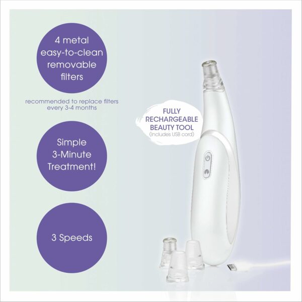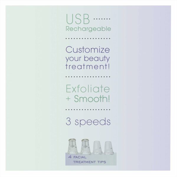 See and feel the difference a complete clean makes for your facial skin! Equipped with 3 speeds and 4 facial treatment tips, True Glow’s innovative Microdermabrasion Beauty Tool uses vacuum suction technology to exfoliate and remove dead skin cells and unclog pores, leaving your skin feeling remarkably radiant and clean. A simple 3-minute treatment is all it takes to reveal brighter, smoother, and more glowing skin. Fully rechargeable with the USB cord provided, this home essential treats your skin to a spa-like indulgence that gently removes dirt and makeup from your pores without irritation for a fresh-faced, healthy-looking glow.