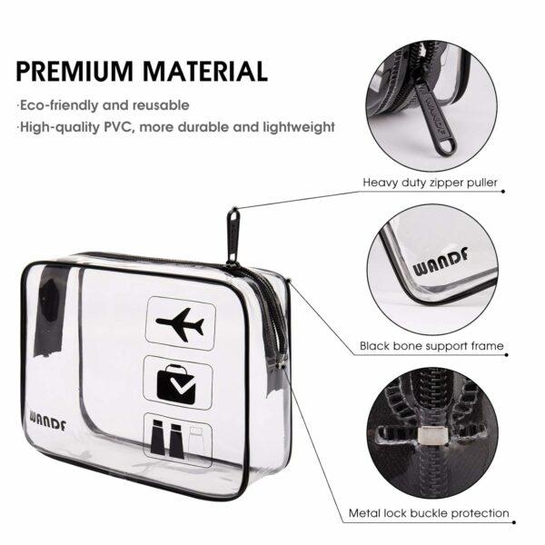 TSA APPROVED — Made of clear PVC fabric, the WANDF toiletry bag strictly adheres to TSA 3-1-1 liquids rules for carry-on bags on all airlines. This makeup bag measures 7.7 x 5.9 x 2.8 inches, which is large enough to hold 100ml liquid bottles. It helps individuals spot items without rummaging through the bag. You cannot imagine how quickly and easily this clear shower bag can help you pass through security screening or find the items you need!