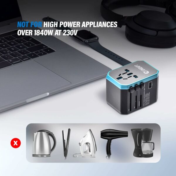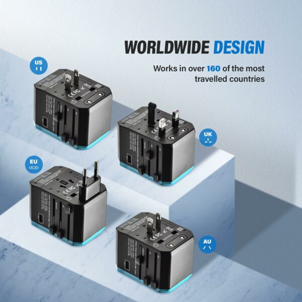 Universal Travel Adapter: the adapter comes in a small compact size with 5 USB ports to power all your devices. Includes 4 USB A and 1 Type C smart charging port. Great convenience as you charge up to 6 devices at the same time in just one outlet!