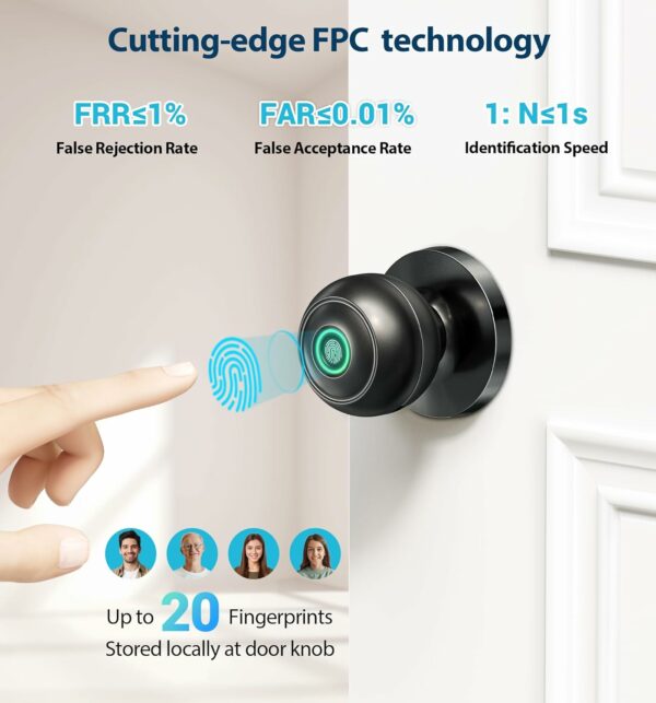 Advanced Biometric Sensor: The Veise fingerprint door lock features an FPC Semiconductor sensor that adapts to changing fingerprint conditions, re-learns, and self-adjusts, unlike conventional optical recognition with low accuracy and adaptability. All fingerprints are stored locally on the lock, ensuring information security
