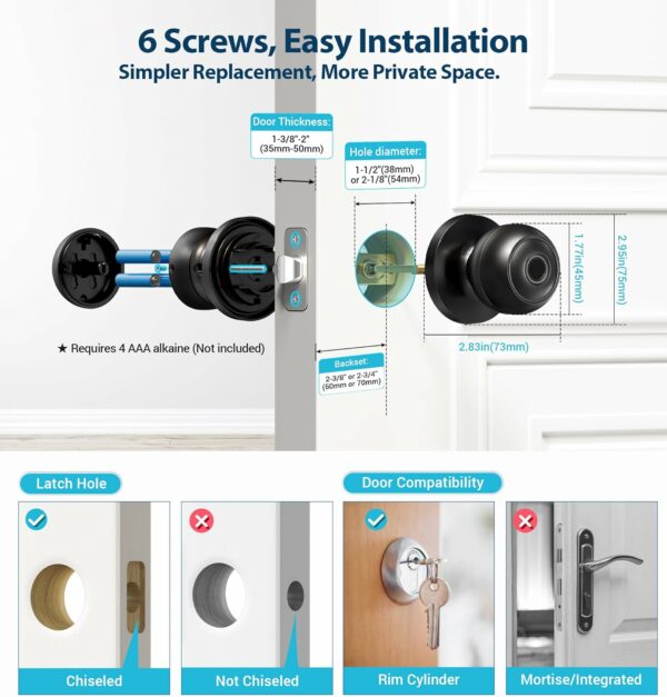 Easy Installation: Installation requires four AAA alkaine batteries (Not included). Just install knob with a screwdriver within minutes to own your personal space. Plus, from the day of purchase, enjoy lifelong online phone and email support