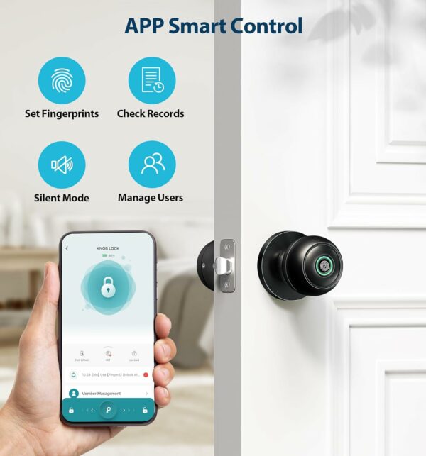 Smart APP Control: Our thumbprint door knob offers convenient control via the smart life app, allowing you to set fingerprints, manage users, check access records, and activate silent mode effortlessly with just a few taps on your smartphone