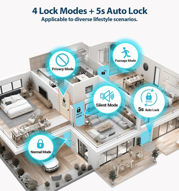 Multifunctional Door Knob: Easily switch between Normal, Passage, and Privacy Modes by rotating the thumb turn, meanwhile activate Silent Mode via the app. Additionally, for personal space and privacy security, our lock features a five-second auto-lock function