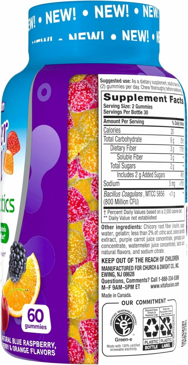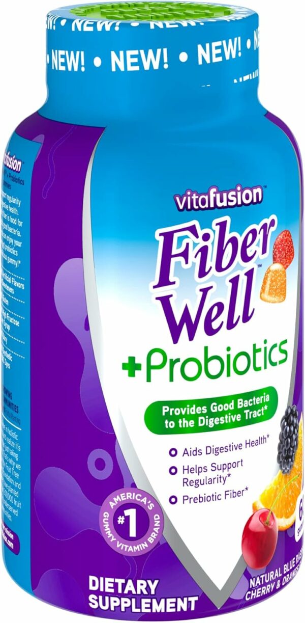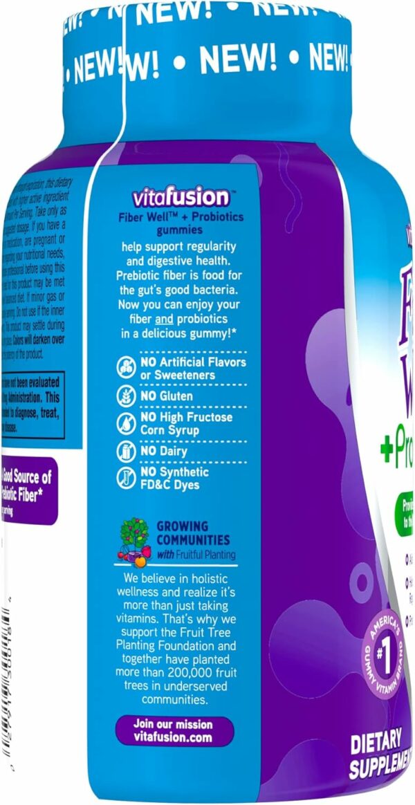 New from America’s #1 Gummy Vitamin brand, introducing – Vitafusion Fiber Well + Probiotics Gummy Vitamins. These fiber and probiotic gummies for adults are delicious way to take your daily fiber supplement for supporting regularity and digestive health.* Each serving contains 3g of fiber and 800 million CFUs of probiotics to provide good bacteria to your digestive tract*. You’ll love the natural blue raspberry, cherry and orange flavored gummies – a tasty alternative to hard-to-swallow fiber pills, fiber capsules, or fiber powder. This 60-count bottle will help you support your gut health* for 30 days. At vitafusion, it is our belief that taste and nutrition can be fused together to deliver the best adult multivitamin experience, ensuring that taking your daily dietary supplements is an easy and delicious part of your day. *These statements have not been evaluated by the Food and Drug Administration. This product is not intended to diagnose, treat, cure or prevent any disease.